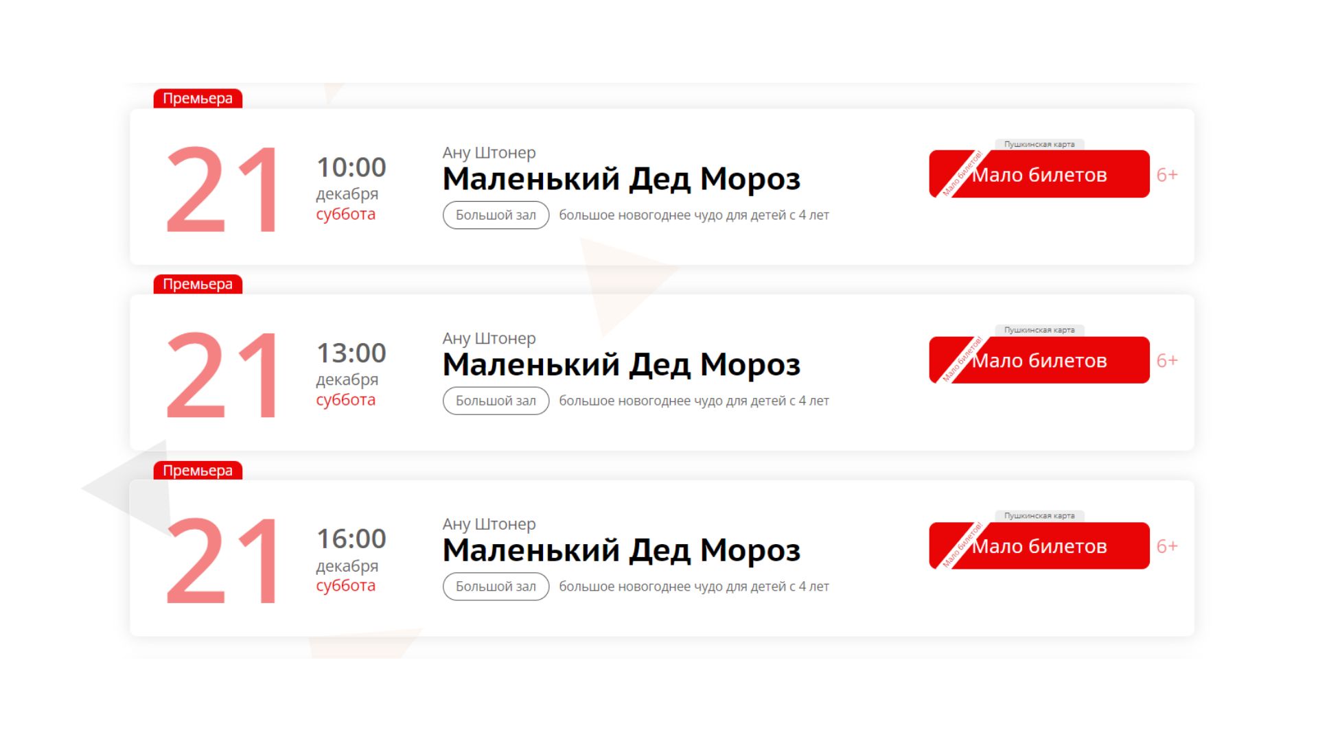 В афише на самое начало декабря в кукольном лаконичное «Мест нет», «Мест нет». Так что на спектакли «В гостях у Дедушки Мороза» и «Маленький Дедушка Мороз» можно и не рассчитывать. Хотя на последний иногда мелькают кнопки «Мало билетов», что-то можно и урвать.