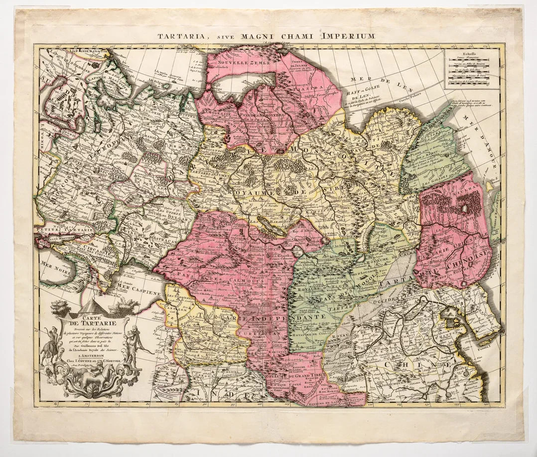На старинной карте XVIII века изображена территория Урала, Сибири и Центральной Азии вплоть до границ Индии и Китая. По этим землям пролегал Великий шелковый путь, по которому в Российскую империю везли чай.