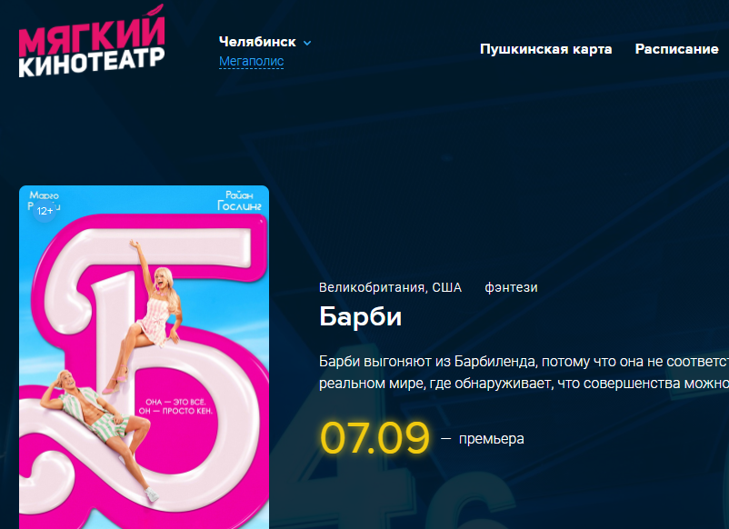 Когда фильм «Барби» появится в расписании других кинотеатров Челябинска — пока неизвестно. Билеты на сеансы в «Мегаполис» купить пока нельзя. Добавим, что реклама фильма появилась и в кинотеатрах соседнего Екатеринбурга — постеры «Барби» и ее альтер-эго «Оппенгеймера» — другой нашумевшей премьеры были замечены в «Пассаже».