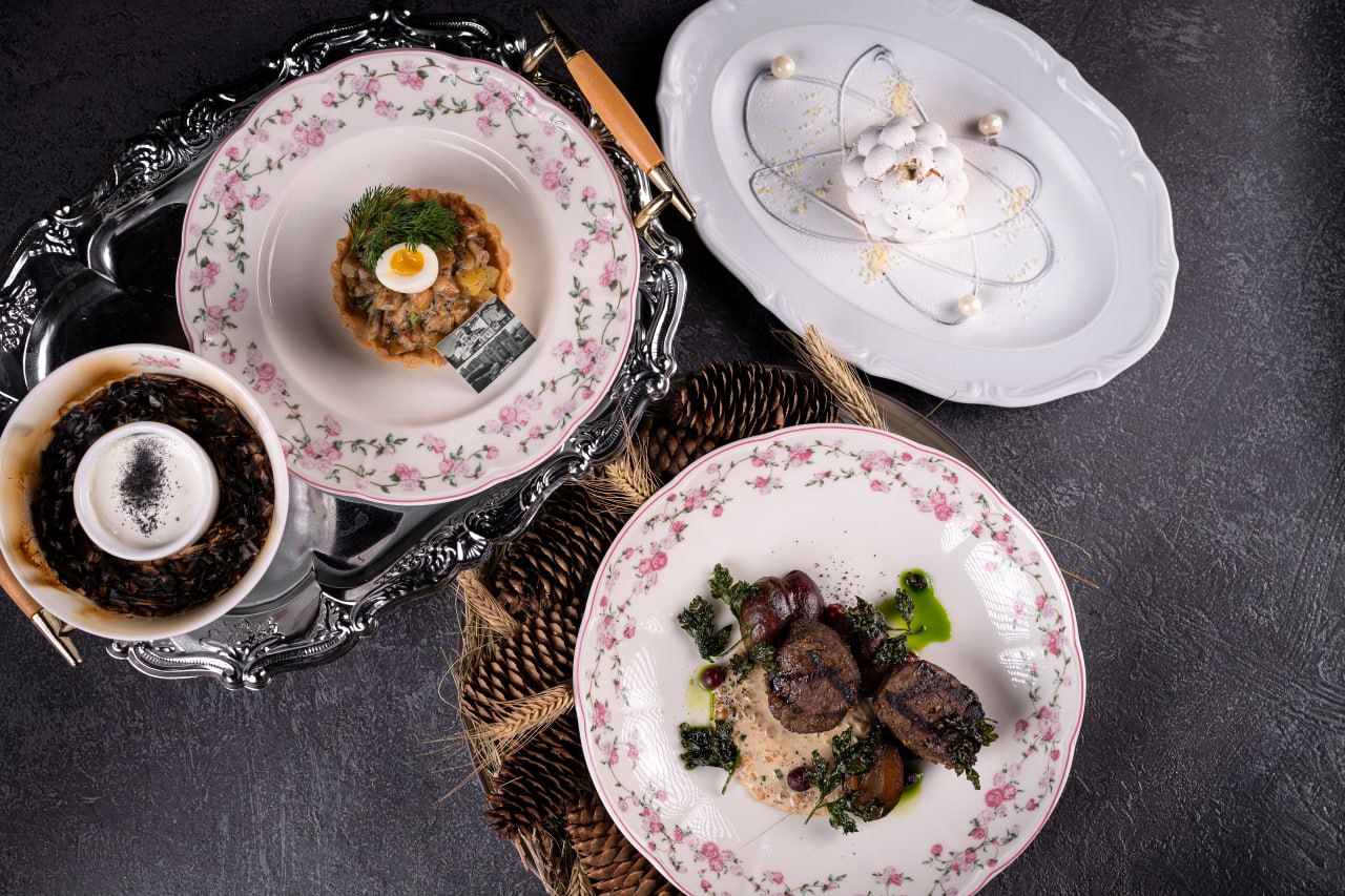 Меню ресторана продумывали на основе существующих уральских рецептов и фантазии бренд-шефа Евгения Михайлова. Так, для гостей подготовили строганину из косули, солодовую лепешку. В горячем есть такие позиции, как голубцы из кролика, котлеты из щуки, кулебяка с кижучем или рябчиком.