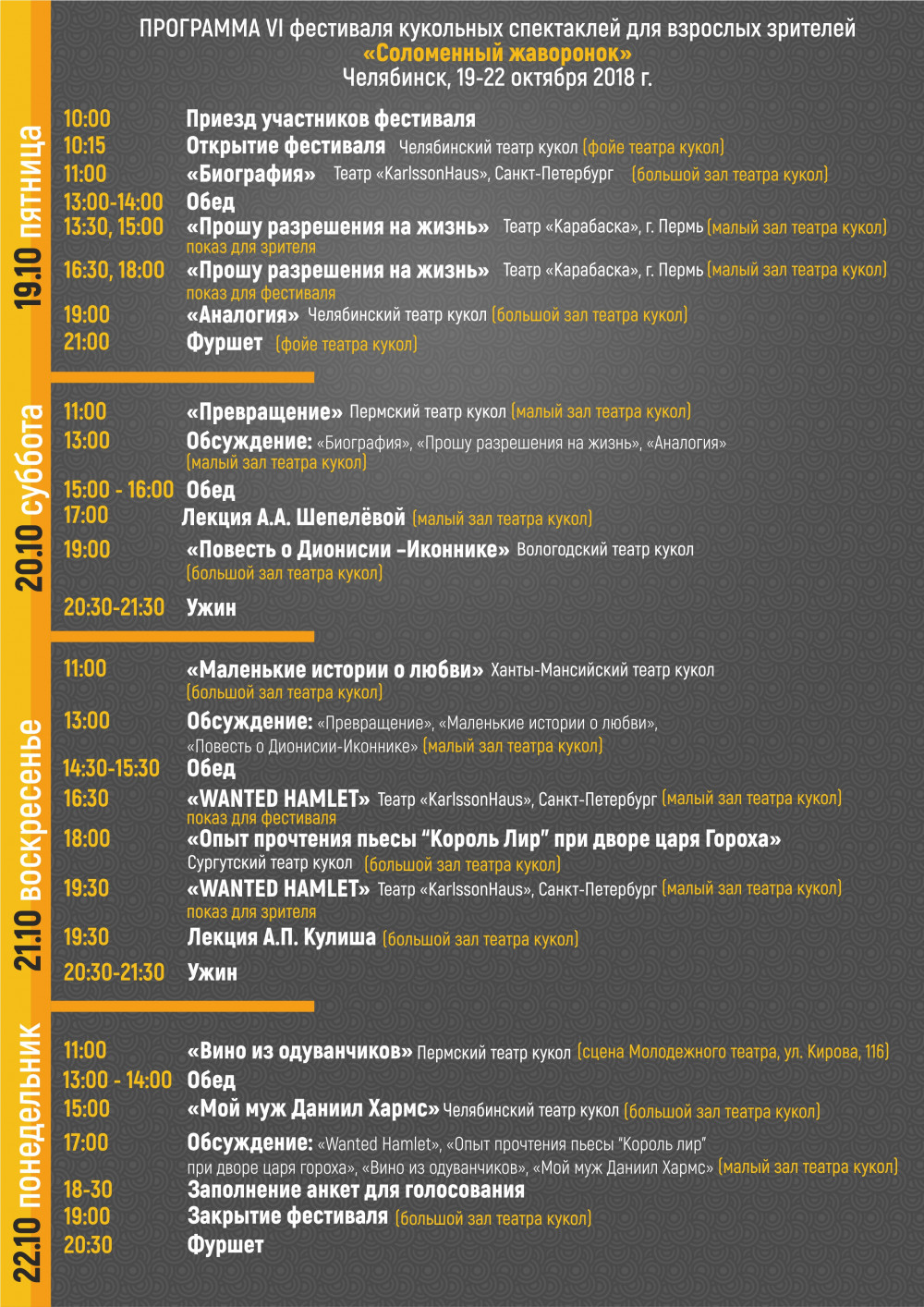 Мы привыкли, что кукольный театр в большей степени работает с детьми, и в этом смысле наш фестиваль — уникальный, поскольку он единственный в России, где театры кукол показывают лучшие спектакли для взрослых. И второй необычный момент: победителя выбирают театры-участники фестиваля, а завоевать признание коллег может быть даже сложнее, чем одобрение экспертов. — отметил министр культуры Челябинской области Алексей Бетехтин.