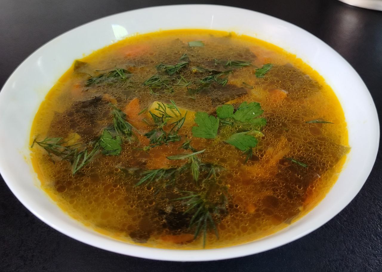 Ингредиенты (на одну порцию): вода или овощной бульон (220 г), сыр адыгейский (15 г), вакаме/нори (2 г), пшено (2 г), картофель (50 г), лук (15 г), морковь (15 г), укроп (2 г), лук зеленый (2 г), масло растительное (10 г), соль, перец черный молотый, куркума, кориандр — по вкусу, лавровый лист.