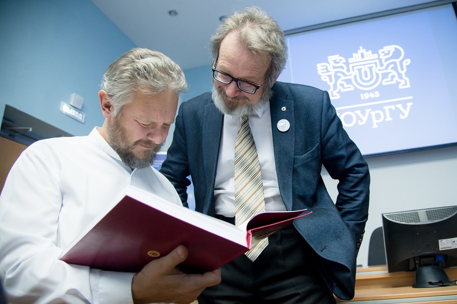 В конце третьего дня юбилейной недели состоялась презентация проекта «История Южного Урала. С древнейших времен до конца ХХ века». Авторами проекта стали директор научно-образовательного центра евразийских исследований Александр Таиров, ведущий научный сотрудник Научно-образовательного центра евразийских исследований ЮУрГУ Сергей Боталов и декан исторического факультета, профессор Игорь Сибиряков.