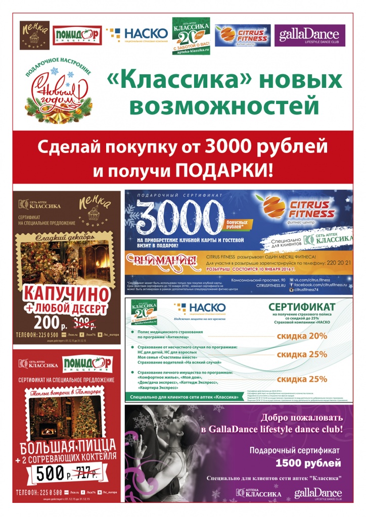 Впереди череда самых любимых зимних праздников — в это время так хочется устроить себе и близким вкусный и романтичный праздник. И снова «Классика» вместе с друзьями дарит клиентам подарочные сертификаты от сети кофеен «Пенка» и пиццерий «Помидор». Только в декабре с подарочным сертификатом из «Классики» у вас появится возможность купить любой десерт и большую чашку капучино за 200 рублей. Специально для клиентов «Классики» за 500 рублей предлагается большая пицца и два согревающих коктейля. Угощайтесь на здоровье!
