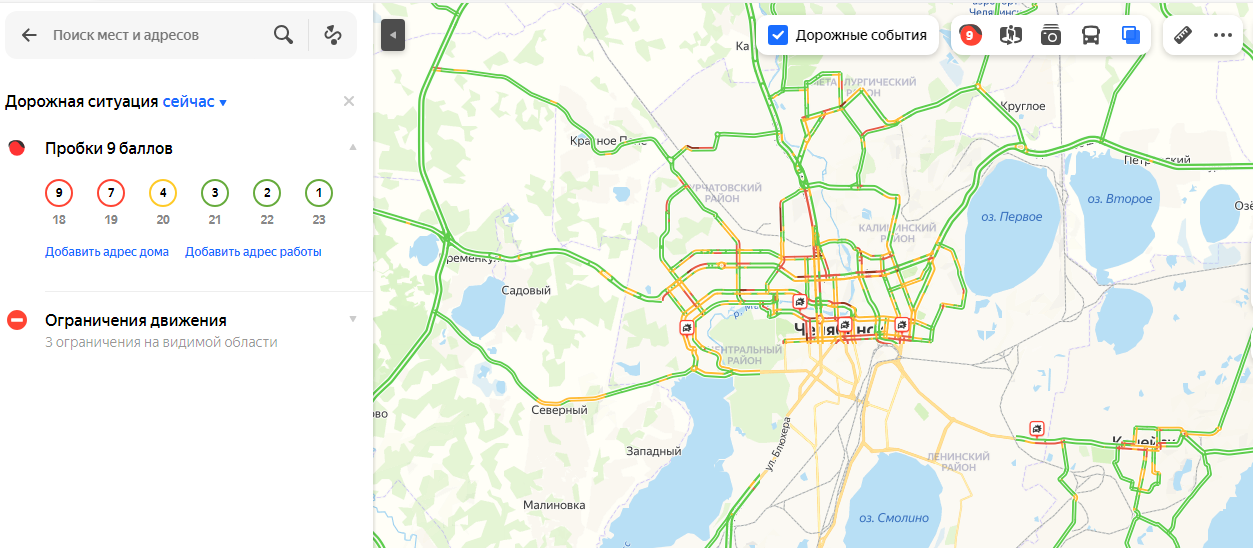 Вечер четверга в Челябинске для многих знаменуется пробками. Многочисленные заторы сковали дороги, сервис «Яндекс Пробки» показывает 9 баллов. Рассказываем, какие улицы лучше объехать, чтобы не застрять по пути домой.