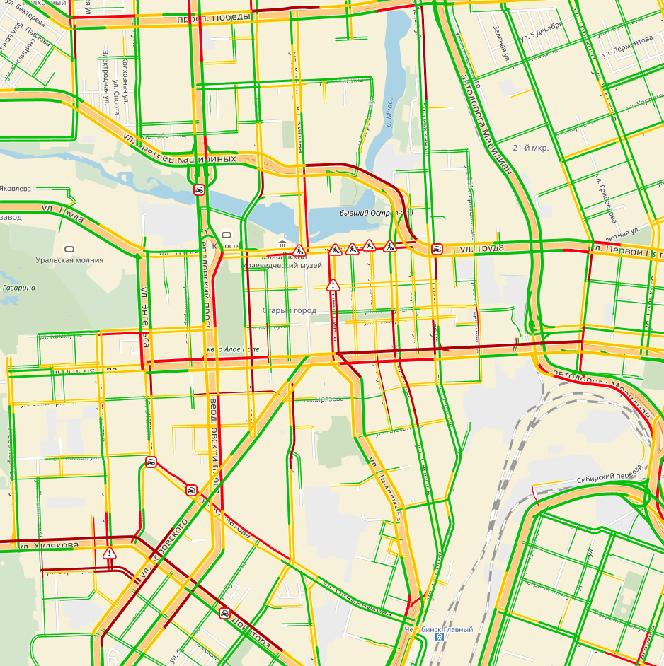Затор также образовался на Свердловском проспекте и пересекающем его проспекте Ленина. Машины стоят на улице Худякова и Доватора, Воровского, на автодороге Меридиан, переходящей в проспект Ленина. Загружен проспект Победы от улицы Попова до Российской и на участке в районе Теплотеха. — информирует «Яндекс. Пробки».