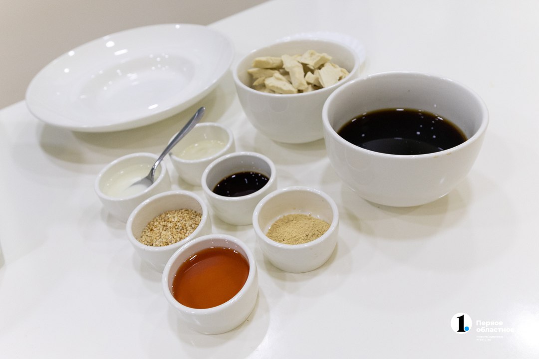 Во время разговора наблюдаем, как рождается одно из таких блюд — «Не-курица в соусе терияки». Роль «птицы» в этом блюде выполняет... пшеница, вернее пшеничный белок — сейтан, известный своей плотной, волокнистой структурой, идеально имитирующей мясо.