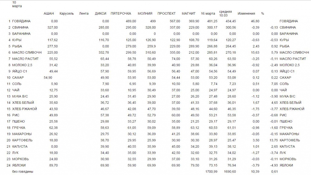 Отметим, что мониторинг проводился по розничным ценам сетевых магазинов в Челябинской области: «Ашан», «Карусель», «Лента», «Магнит» (семейный), «Пятерочка», «Дикси», «Молния», «Проспект». Сравнить стоимость продуктов в магазинах можно в таблице, представленной внизу.