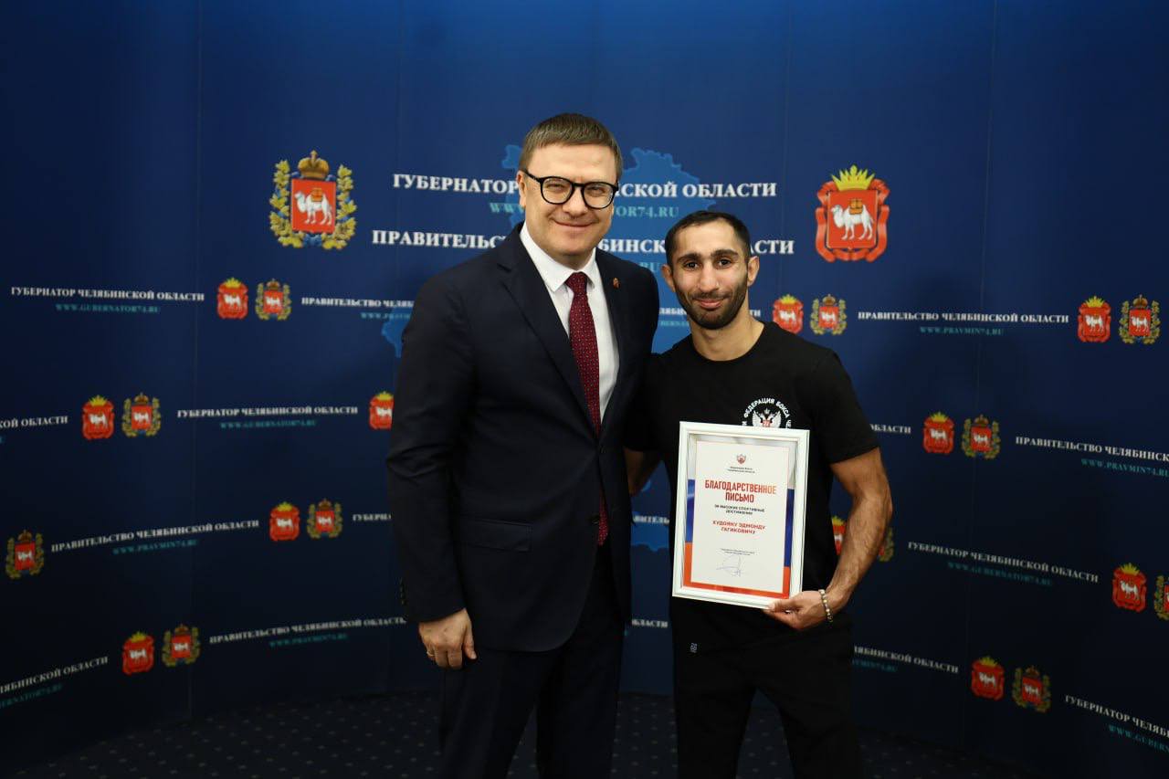 Губернатор Челябинской области Алексей Текслер встретился с южноуральскими боксерами Эдмондом Худояном и Владиславом Маточкиным. Глава региона, будучи президентом региональной Федерации бокса, вручил спортсменам благодарственные письма Федерации и поздравил их со значимыми победами, сообщили в пресс-службе правительства Челябинской области.
