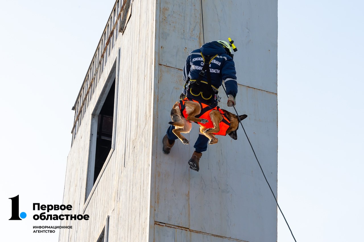Отдельно спасатели показали работу кинологического подразделения. Собака на тренировочной территории, где имитируется завал, находит условного пострадавшего, о чем извещает лаем. Рядом на высотном тренажере отрабатывается спуск с собакой.