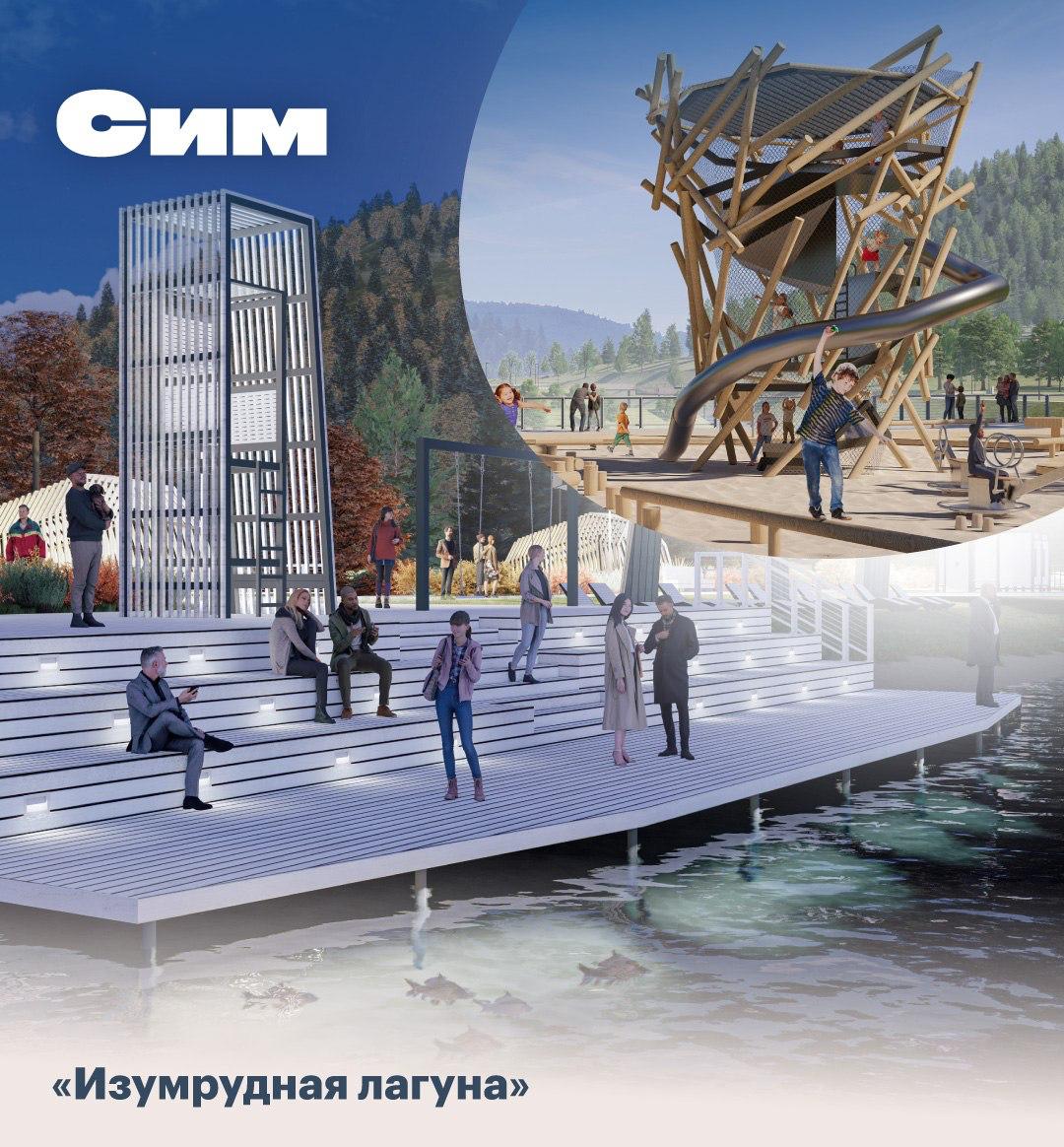В Симе реализуется проект «Изумрудная лагуна», который создаст новое привлекательное пространство для прогулок и отдыха на берегу Симского пруда. Инфраструктура включает благоустроенный пляж, детскую площадку, лыжероллерную трассу, домики и беседки для барбекю, пирс с арт-объектом, пешеходный мост и сцену для проведения мероприятий.