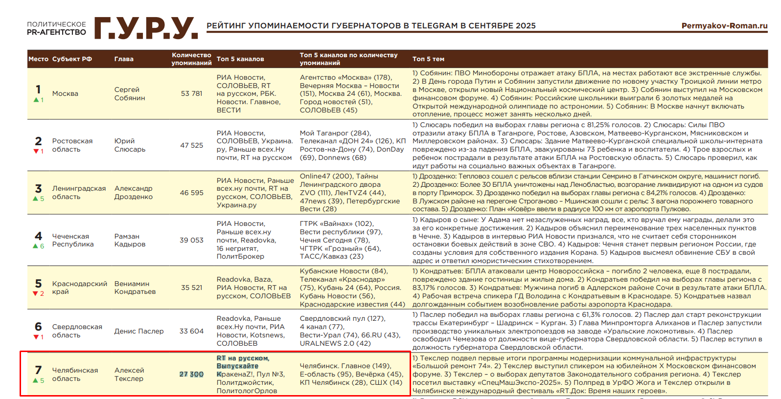 Губернатор Челябинской области Алексей Текслер занял 7‑е место по упоминаниям среди губернаторского корпуса, поднявшись по сравнению с августом сразу на пять пунктов, сообщает информационное телеграм-агентство «Теле Стрим». Как говорится в новом исследовании «Индекс Telegram», глава региона был упомянут 27 тысяч 300 раз.