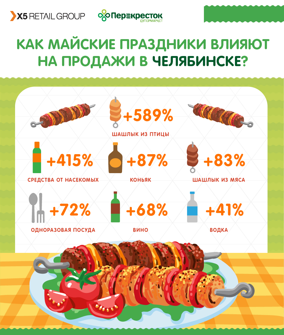 В период майских праздников максимальный рост продаж демонстрируют шашлык из птицы (+589%) и средства от насекомых (+415%). Высоким спросом среди челябинцев пользуются коньяк (+87%), шашлык из мяса (+83%) и одноразовая посуда (+72%). В ТОП-7 товаров на майские праздники вошли вино (+68%) и водка (+41%).