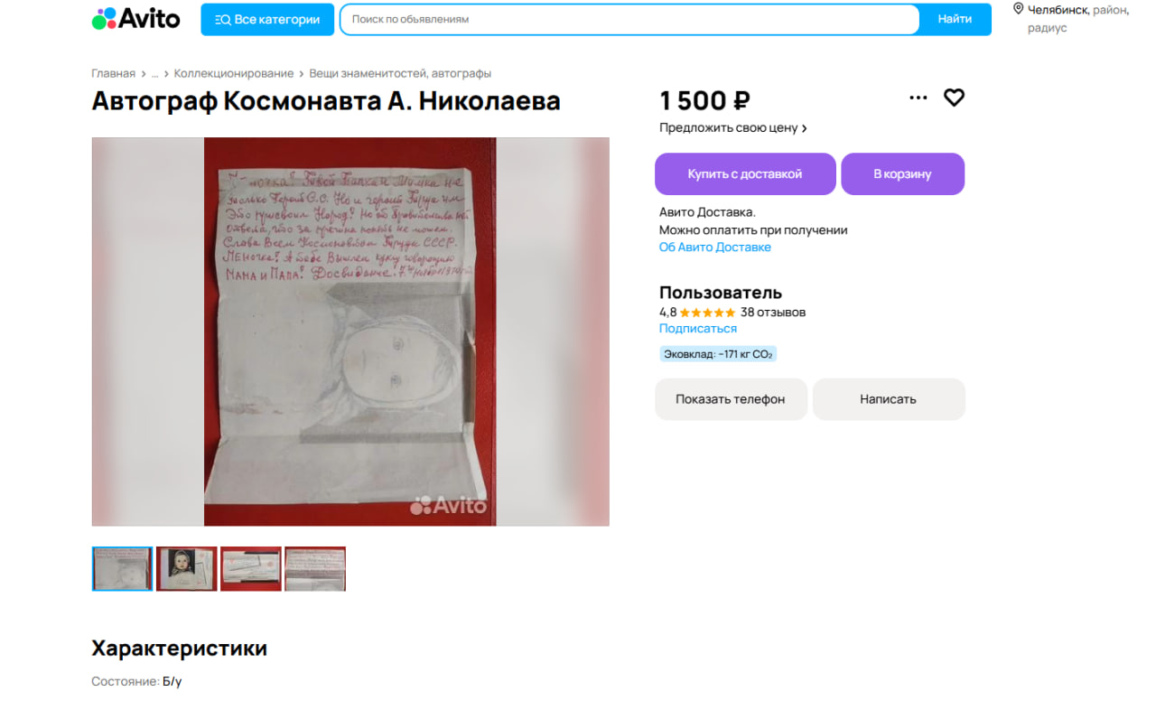 За 1500 рублей можно приобрести крайне редкую вещь, по словам продавца, — автограф третьего советского космонавта Андрияна Николаева. Он представляет собой небольшое письмо дочке на выцветшей упаковке от шоколадки «Аленка». В нем он пишет, что ему присвоено звание героя СССР и трогательно обещает выслать говорящую куклу.