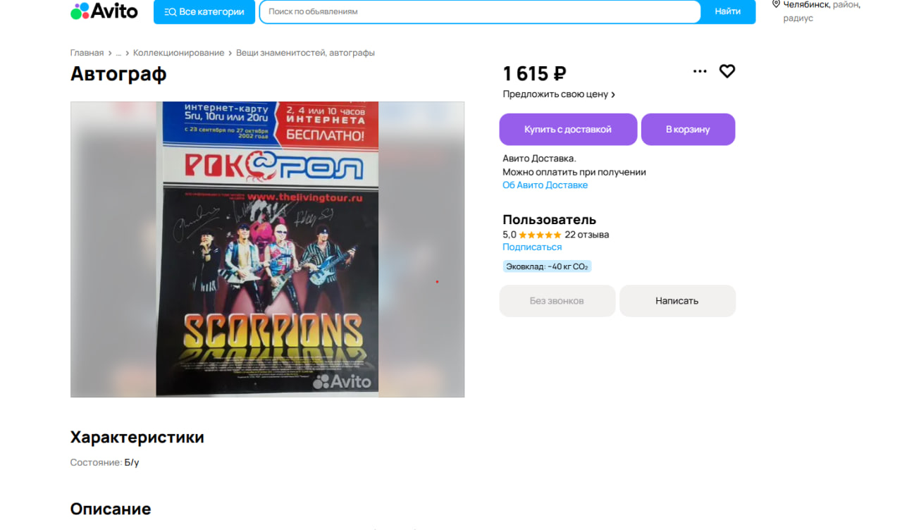Для любителей рока на сайте нашелся автограф группы Scorpions. В описании указано, что одна из подписей размазалась, поэтому афишу можно приобрести со скидкой за 1615 рублей.