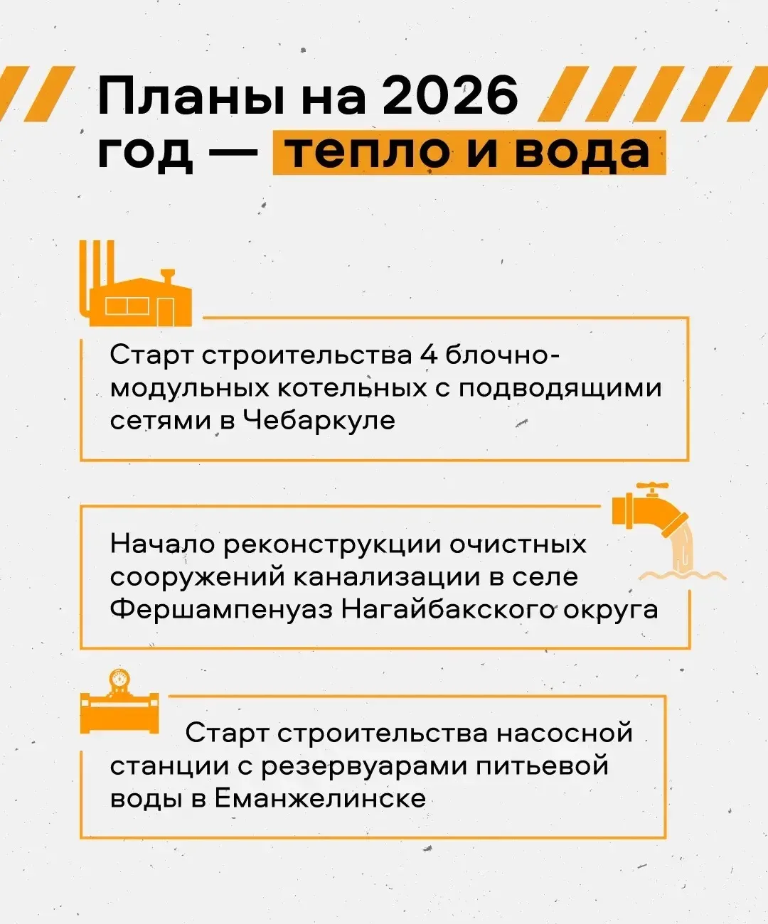 «В 2026 году темп снижать не будем. Продолжим обновлять сети теплоснабжения, водоснабжения и водоотведения, построим новые котельные, проведем газ в новые населенные пункты Южного Урала».