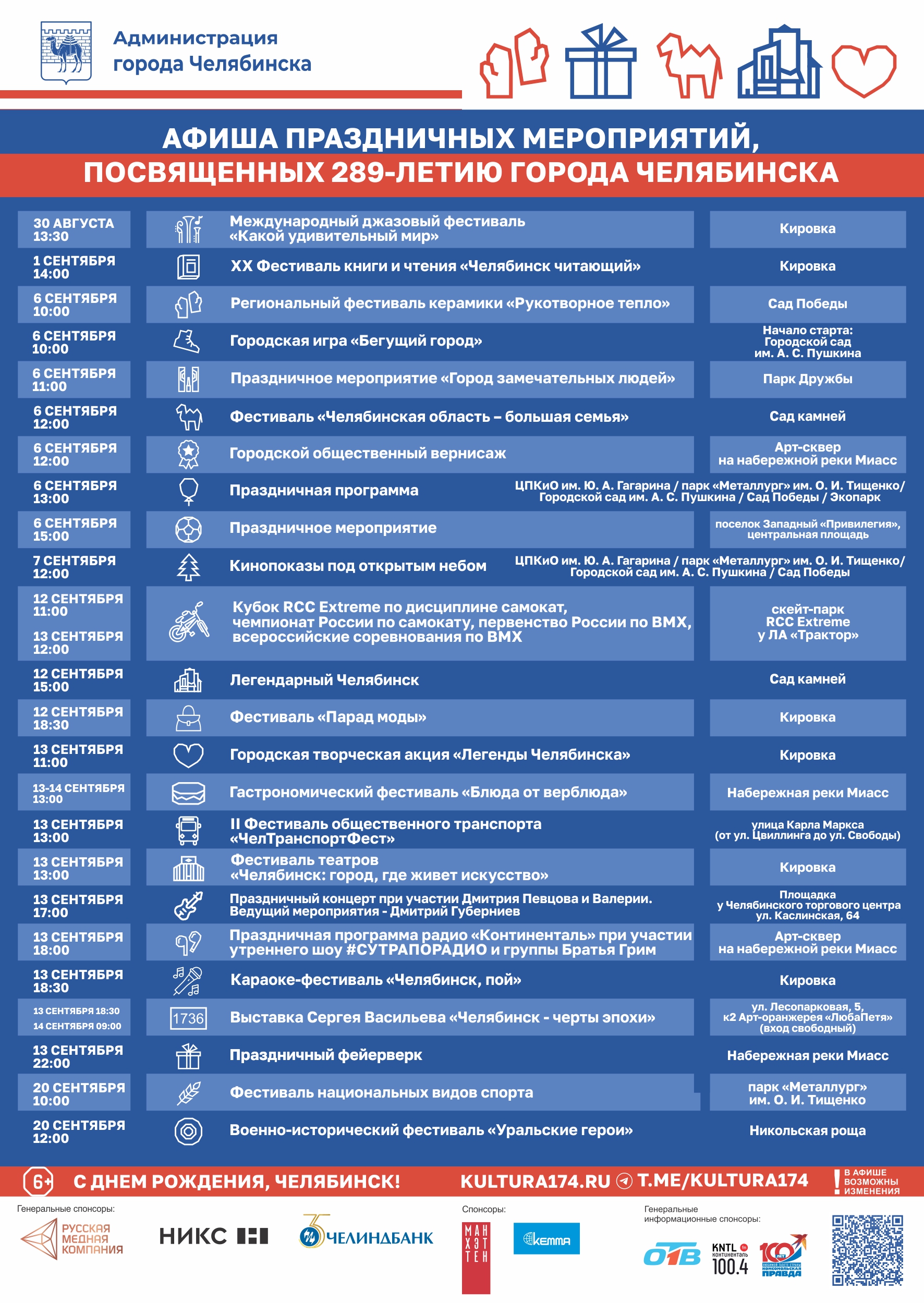 Челябинск готовится отмечать 289-летие. Первые мероприятия начнутся уже на этой неделе, 30 августа, а продлится праздник вплоть до 20 сентября. Основная программа запланирована на 13 сентября, в этот день пройдет несколько фестивалей, концерт с Валерией и фейерверк. Афишу (6+) опубликовала администрация города.