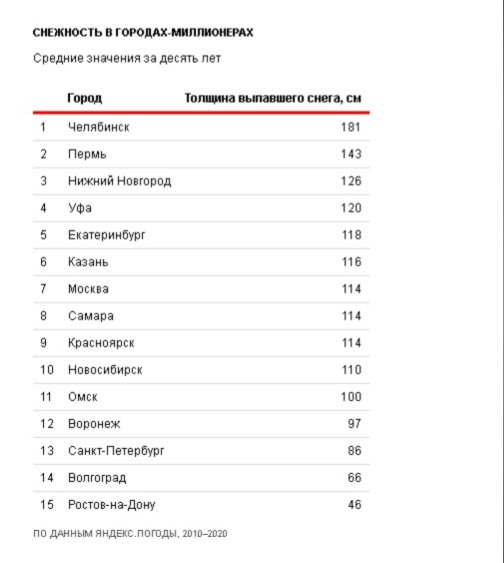 Если представить, что над всей территорией Челябинска осадки выпадают равномерно, получится, что на город ложится примерно 91 миллион КамАЗов снега. В сумме снег лежит около 182 дней и сходит обычно в конце апреля.