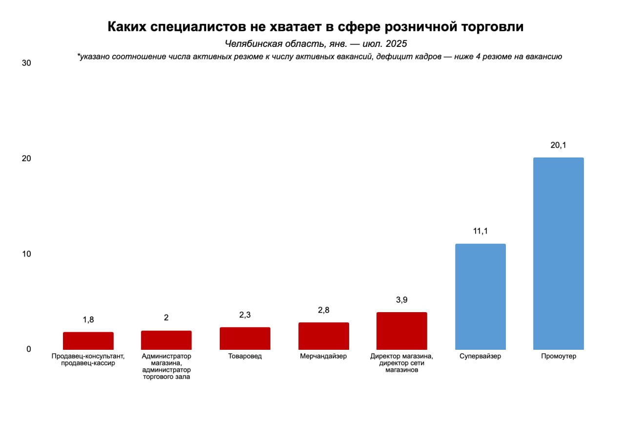 Согласно исследованию аналитиков hh.ru, рынок розничной торговли в Челябинской области столкнулся с серьезной нехваткой квалифицированных специалистов. Несмотря на рост активности соискателей, на одну вакансию в ретейле приходится всего 2,1 резюме, что значительно ниже нормы, составляющей от 4 до 7,9 резюме на вакансию.