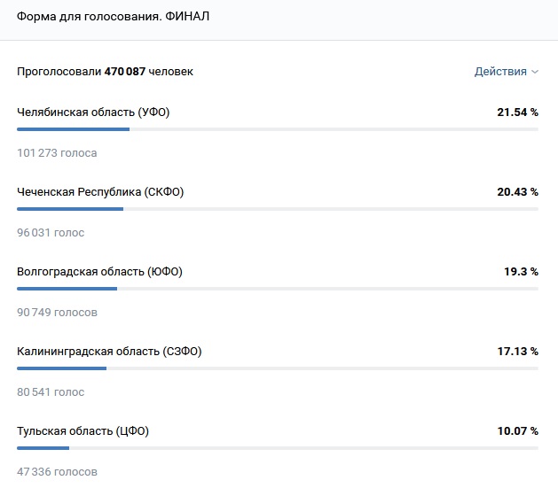 Жители Челябинской области активно голосовали за ролик от своего региона на всех этапах. Утром 30 марта стало известно, что Южный Урал стал победителем всероссийского конкурса видеороликов о результатах реализации федерального проекта «Формирование комфортной городской среды», набрав 21,54% голосов. На втором месте по результатам голосования стал ролик о достижениях Чеченской Республики, на третьем — ролик от Волгоградской области.