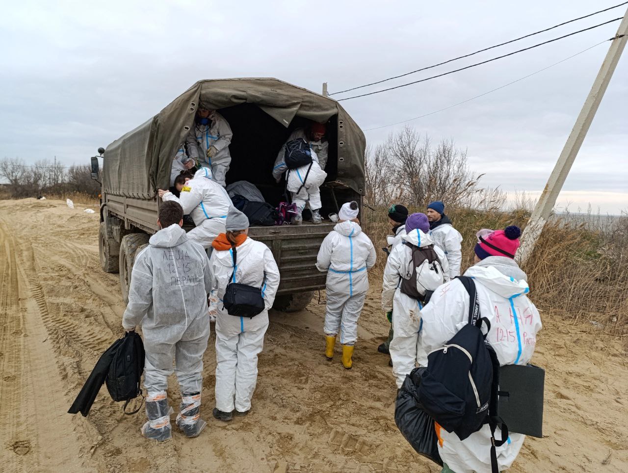 До штаба добровольцев довезли на микроавтобусе, покормили, обеспечили костюмами, масками, перчатками и очками. На точку сбора мазута ехали в кузове военного «Урала» — он может ехать с грузом по песку.
