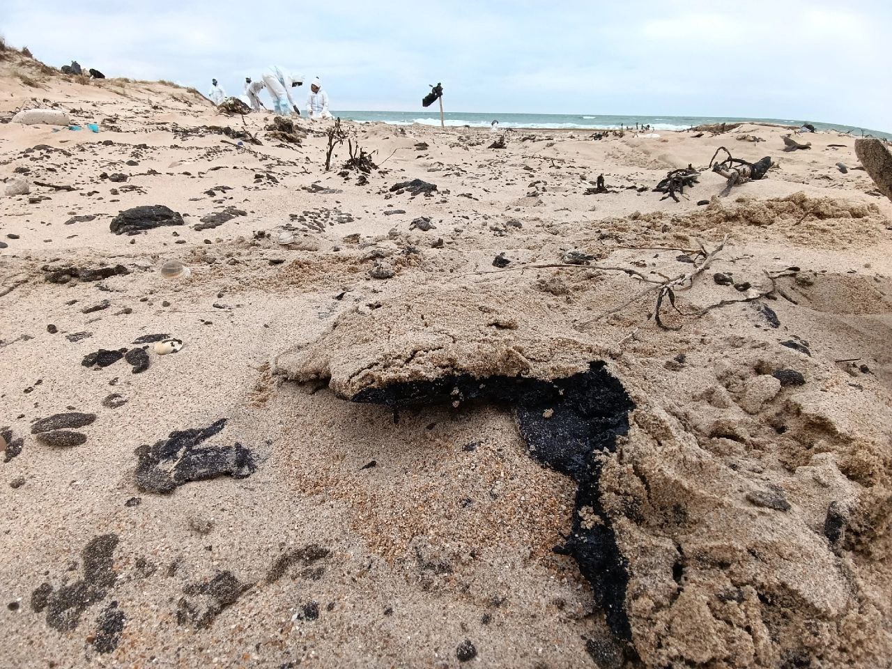 «Бугазская коса. Такой жести, как в первые дни, уже нет. Но теперь проблема в другом. Слои мазута находятся под песком. В разных местах. Мы соскребали видимые куски в кучки. Перегружали их в мешки. А часть просеивали, чтобы минимизировать количество песка в мешках. По-хорошему, чтобы избавиться от мазута, нужно просеять все побережье», — сообщает Артур.