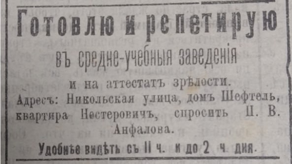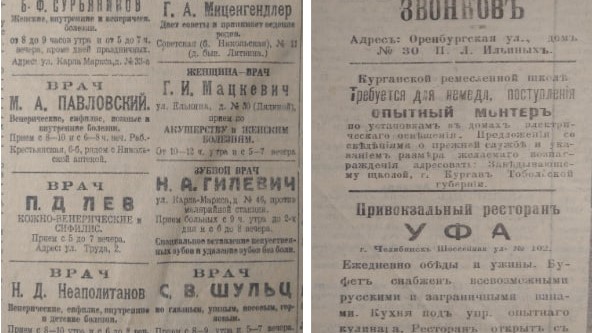 Архивные объявления начала XX века рассказывают о жизни челябинцев того времени. Врачи, стоматологи, акушерки — эти специалисты были жизненно необходимы. Не менее востребованы были и репетиторы, готовившие учеников к поступлению в учебные заведения. Как и сегодня, дополнительное образование играло важную роль, но было доступно лишь немногим.