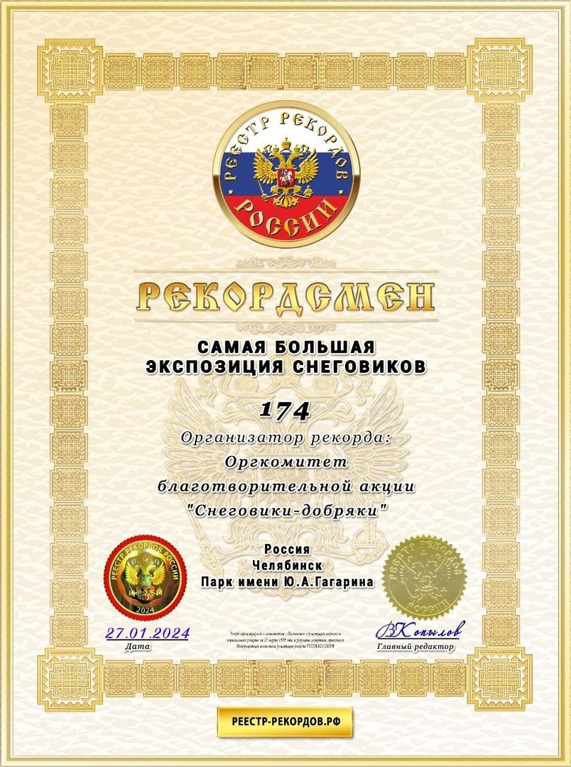 Оргкомитет акции «Снеговики-добряки» получил сертификат из Реестра рекордов России. В нем говорится, что во время флешмоба по лепке снеговиков, который прошел в Челябинске 27 января, была создана самая большая экспозиция снеговиков в России. Об этом сообщает уполномоченный по правам детей в Челябинской области Евгения Майорова.
