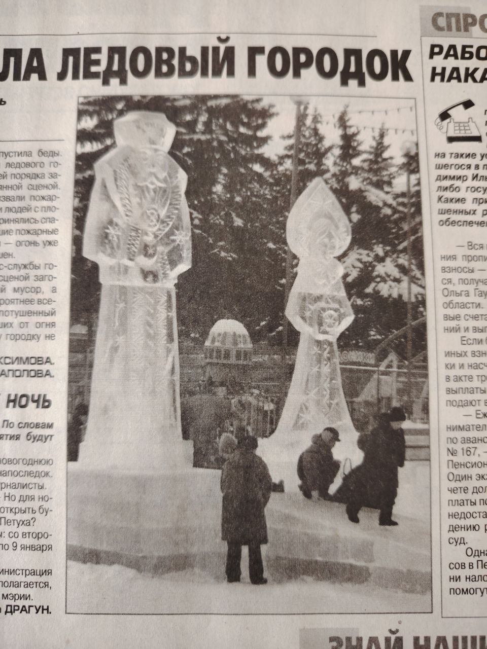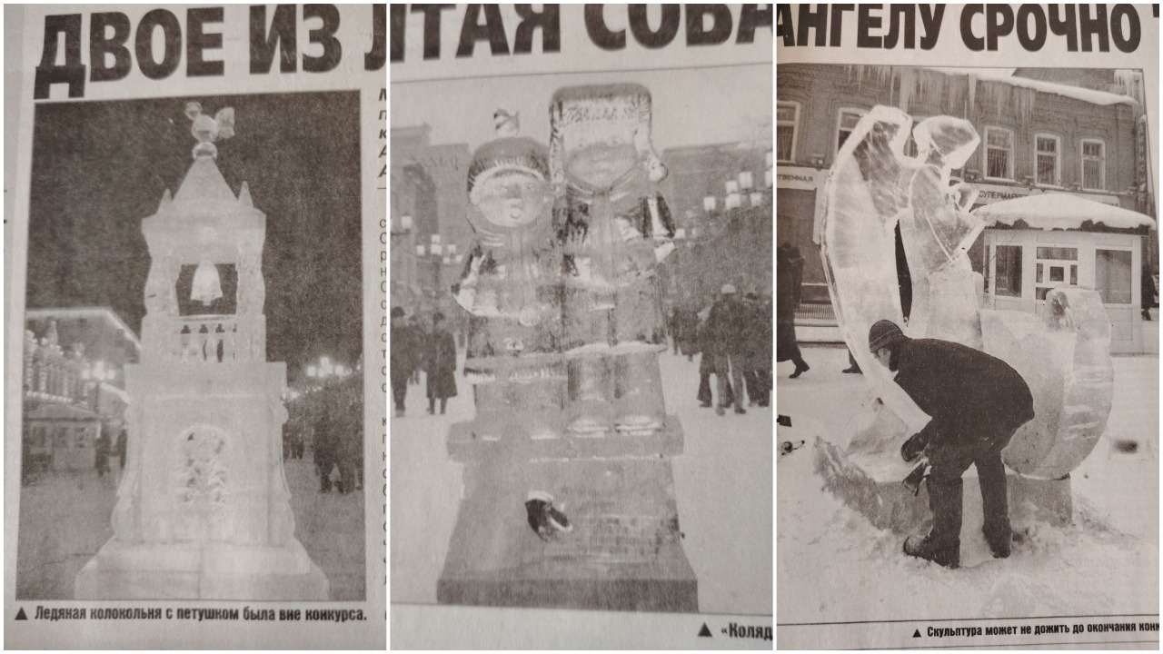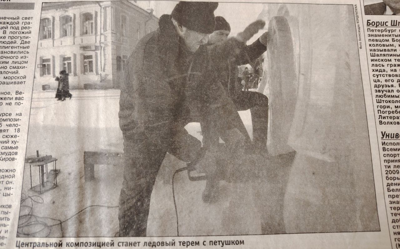 «В воскресенье на постаменты водрузили ледяные глыбы. А с начала недели бригады скульпторов приступили к работе. Сейчас основная часть ледяных громадин приняла свою форму, а мастера перешли от „топорной“ работы к косметической отделке. Впереди самая сложная часть: авторам нужно сделать свои творения „живыми“, изящными, чтобы каждая грань заиграла», — поясняли в газете.