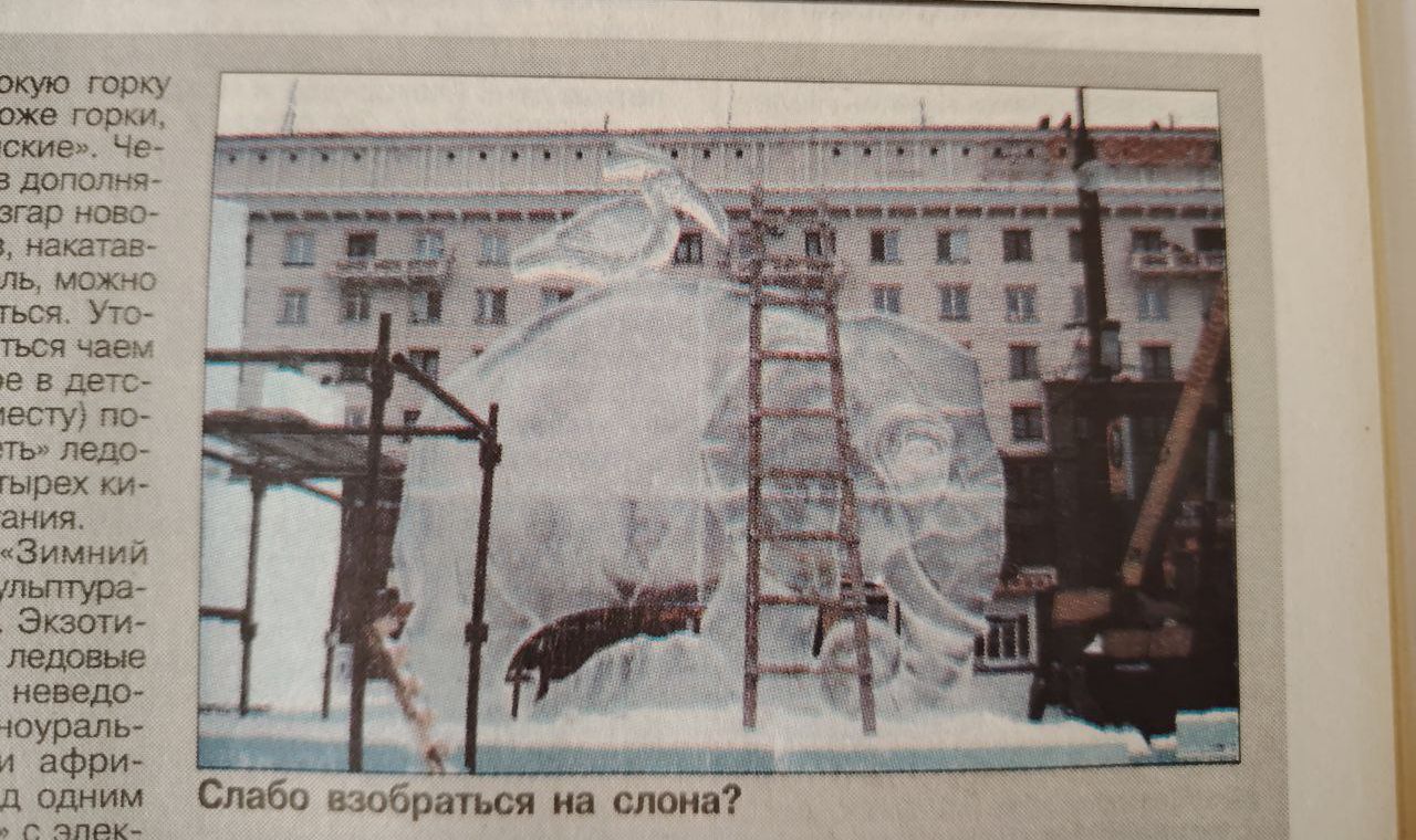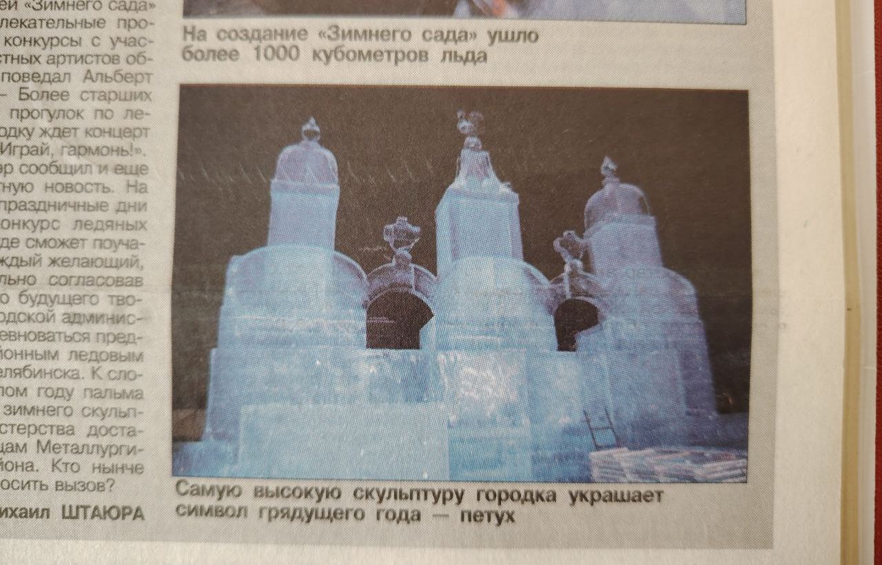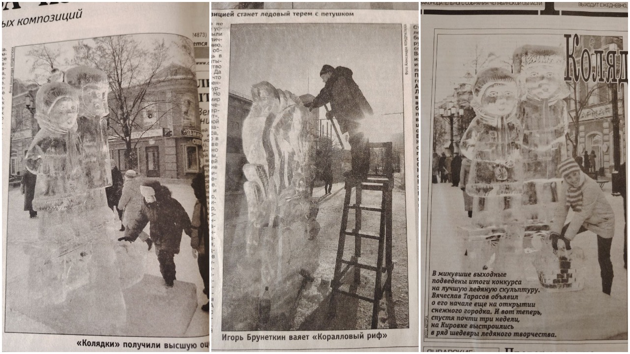 «Потепление не сможет сорвать первый городской конкурс ледяных скульптур. Ваятели готовы укрывать творения простынями. <…> Грани фигур округлились, а поверхности стали не такими отполированными. Конструкции обтекли. Львиная доля времени ушла на выравнивание и заострение граней — в скульптуре важна каждая черточка», — писали в газете «Вечерний Челябинск».