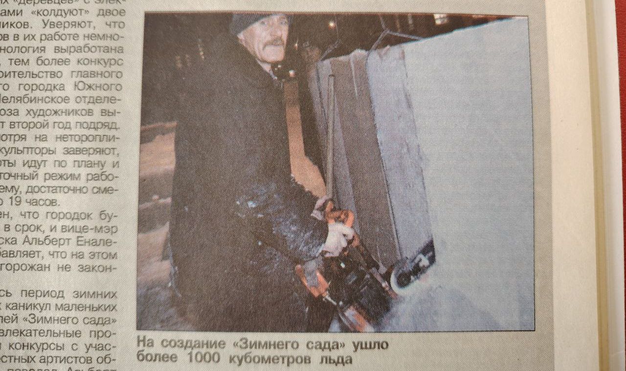 На создание ледового городка, получившего название «Зимний сад», в декабре 2004 года ушло более 1000 кубометров льда. Такая цифра нашлась в газете «Челябинский рабочий». Открыли новогоднюю площадку 27-го числа, кажется, этой традиции уже много лет. Скульптуры создавали с десяток рабочих Челябинского отделения Союза художников России.