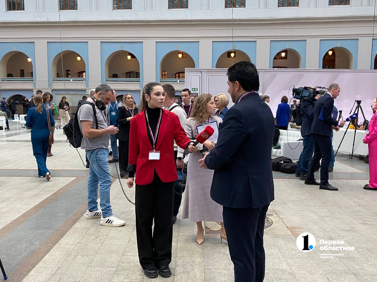 Большинство корреспондентов будто сговорились: пришли в красных и синих костюмах, видимо, в цвет российского триколора.