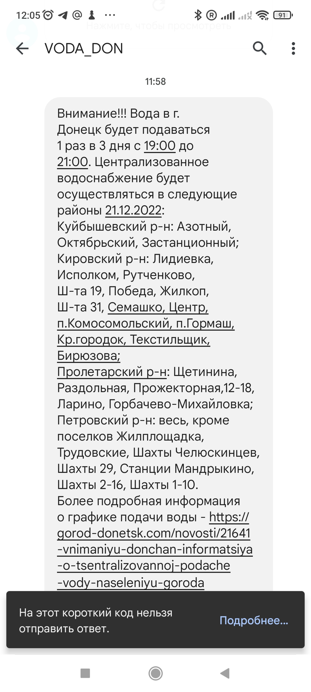 По словам женщины, с лета ситуация с водой в Донецке, и без того сверхкритическая, стала еще острее. Если раньше еще были отдельные дома в городе, где воду для питья в краны подавали хотя бы на час в день, то теперь в лучшем случае — один раз в три дня и лишь на пару часов. Хочешь иметь возможность умыться и смыть унитаз (или приготовить пищу) — подгадывай свой график и сверяй его с тем, что присылает по СМС на симки местного сотового оператора «Феникс» городской водоканал.