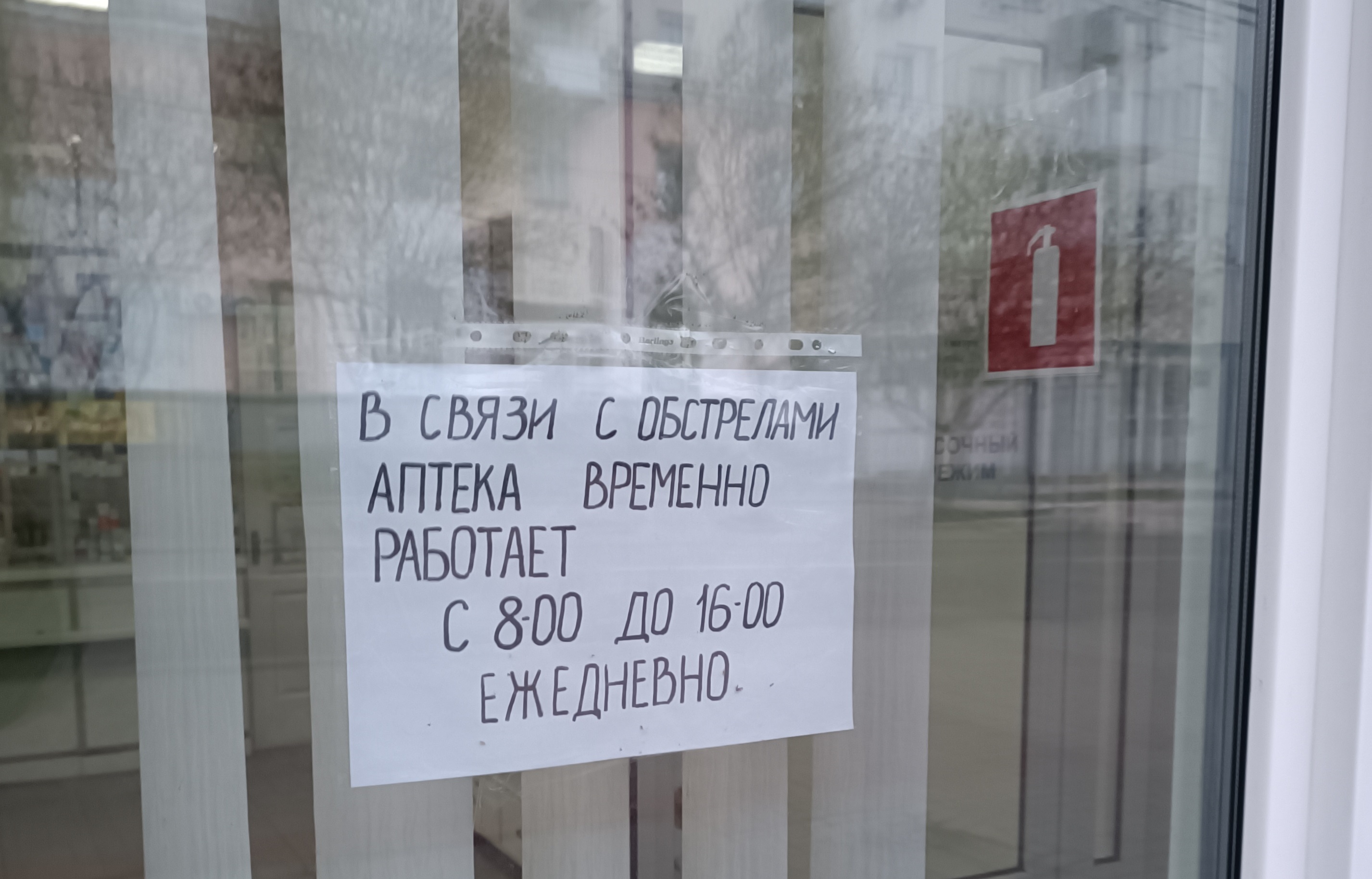 «В связи с обстрелами аптека временно работает с 8:00 до 16:00», — написано на белом листке бумаги, заботливо упакованном в файлик и приклеенном к входной двери павильона.