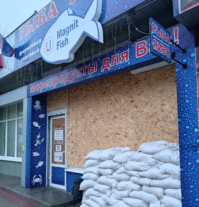 Но есть нюанс: то, что когда-то было окнами павильона, наглухо забито фанерой, а снаружи дополнительно уложены мешки с песком. Последствия «прилета» и хоть какая-то попытка защититься от следующего…