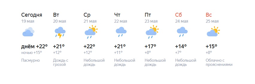 В Челябинске до четверга столбики термометров будут подниматься до +20…+22 градусов. Небольшие дожди, возможны грозы. В пятницу температура снизится до +17 градусов, небольшой дождь сохранится. В субботу и воскресенье будет еще прохладнее — около +14 градусов. Осадков не будет лишь в воскресенье.