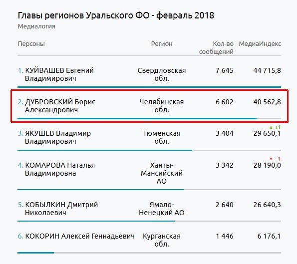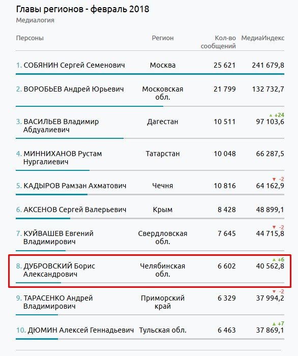 Медиарейтинг губернаторов за февраль 2018 года представила компания Медиалогия. По этим данным, глава Челябинской области Борис Дубровский часто упоминался в СМИ. Он вошел в первую губернаторскую десятку. Медиаиндекс Бориса Дубровского — 40 562, а позиция — восьмая. Таким образом глава региона почти в два раза улучшил предыдущий показатель.