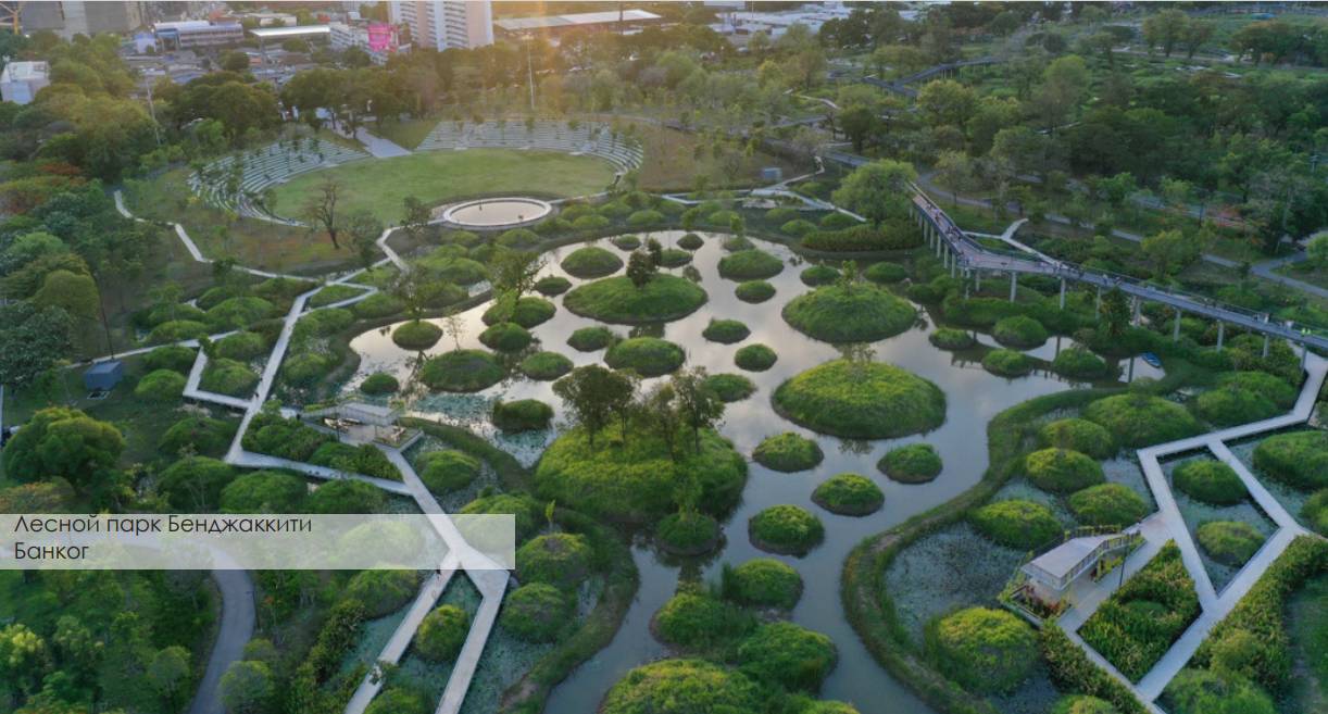 Можно сделать террасы, или лакуны, или углубления, чтобы собрать воду. А можно — извилистое русло — меандры. Можно поиграть глубиной или высотой — в Китае или Таиланде, например, делают искусственные острова из раздробленного и переработанного асфальта и бетона и сверху насыпают земли.