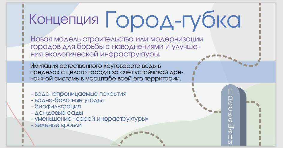 Новая модель строительства или модернизации городов для борьбы с наводнениями и улучшения экологической инфраструктуры — это концепция города-губки. Имитация естественного круговорота воды в пределах целого города за счет устойчивой дренажной системы в масштабе всей его территории. Ключевой постулат здесь — «мы не спорим с природой, а начинаем наблюдать за ней и имитировать природные процессы».