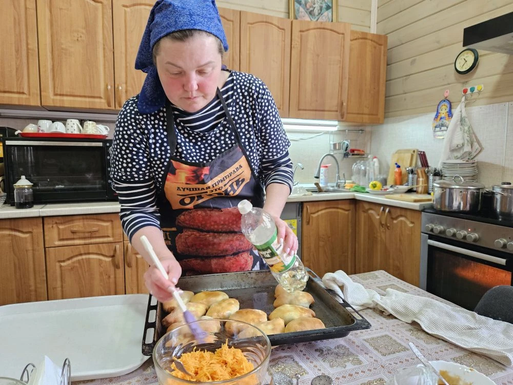 На кухне Александра чувствует себя как дома. Она признается, что редко пользуется рецептами — готовит по наитию, «что вижу, то и кидаю». Но некоторые блюда стали визитной карточкой. В пост она кормит прихожан сытно и разнообразно: гречневый суп, макароны с грибами, пирожки с картошкой и квашеной капустой, салаты, запеканки.