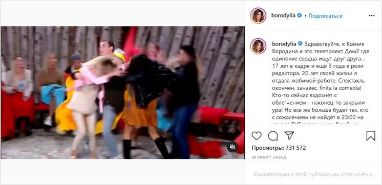 «17 лет в кадре и еще 3 года в роли редактора. 20 лет своей жизни я отдала любимой работе. Спектакль окончен, занавес, finita la comedia! Кто-то сейчас вздохнет с облегчением — наконец-то закрыли, ура! Но все же больше будет тех, кто с сожалением не найдёт в 23:00 на канале ТНТ реалии шоу Дом2, не услышит больше привычный мотив „15 клевых“», — пишет Бородина.