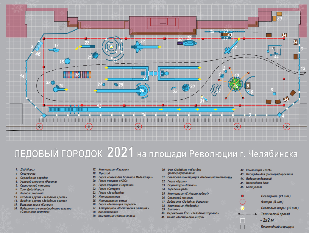«По периметру городок огородят, а со стороны улиц Воровского и Цвиллинга установят входные группы „Звездные врата“. Сразу восемь горок будут работать в космическом ледовом городке. Это большая горка „Космос“, горки поменьше — „Сатурн“, „Звездолет“, „Созвездие Большой Медведицы“, „Летающая тарелка“, „Буран“ и две горки-ловушки — „Спутник“ и „НЛО“»,— добавили представители управления культуры Челябинска.