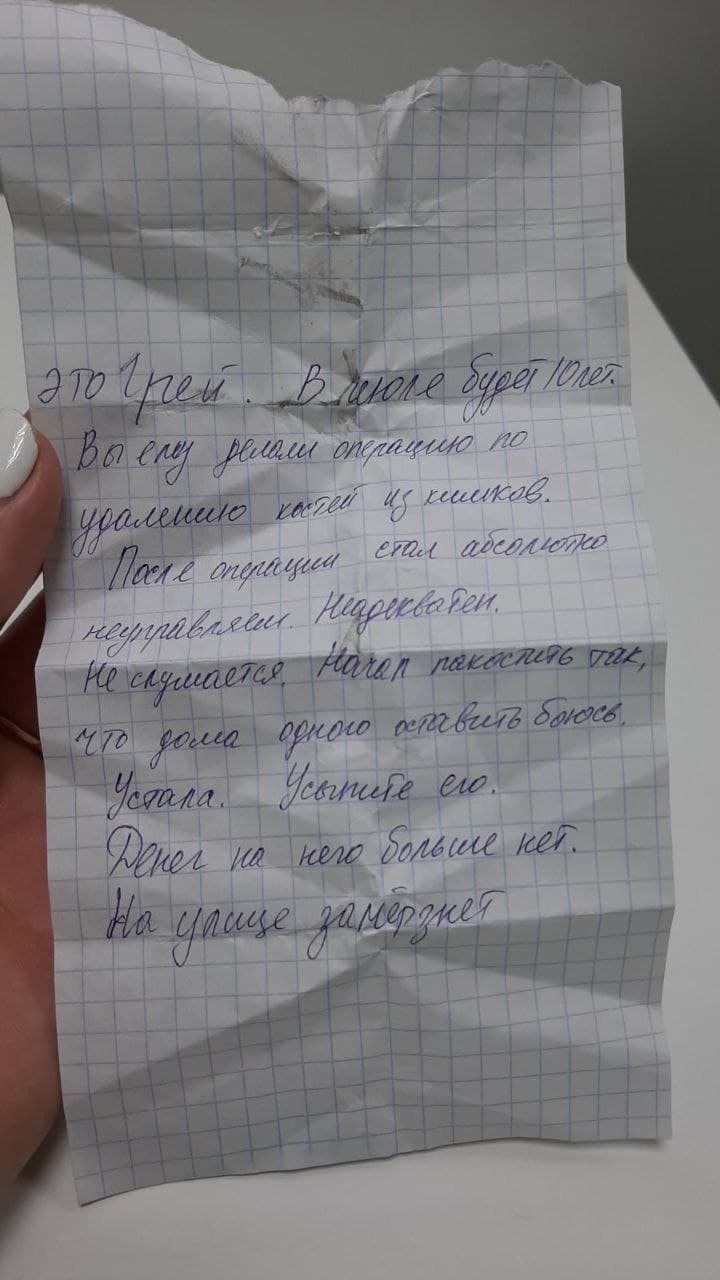 «Это Грей. В июле будет 10 лет. Вы ему делали операцию по удалению костей из кишков. После операции стал абсолютно неуправляем. Неадекватен. Не слушается. Начал пакостить так, что дома одного оставить боюсь. Устала. Усыпите его. Денег на него больше нет. На улице замерзнет», — гласил текст записки.