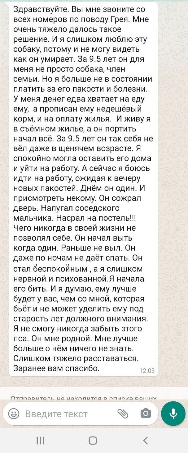 «У меня денег едва хватает на еду ему, а корм ему прописан недешевый, и на оплату жилья. И живу я в съемном жилье, а он портить начал все. За девять с половиной лет он так себя не вел даже в щенячьем возрасте. Я спокойно могла оставить его дома и уйти на работу. А сейчас боюсь идти на работу, ожидая к вечеру новых пакостей. Днем он один. И присмотреть некому... Я думаю, ему лучше будет у вас, чем со мной, которая бьет и не может под старость лет уделить должного внимания. Я не смогу никогда забыть этого пса. Он мне родной. Мне лучше о нем больше ничего не знать. Слишком тяжело расставаться. Заранее вам спасибо», — написала экс-хозяйка Грея сотрудникам клиники.