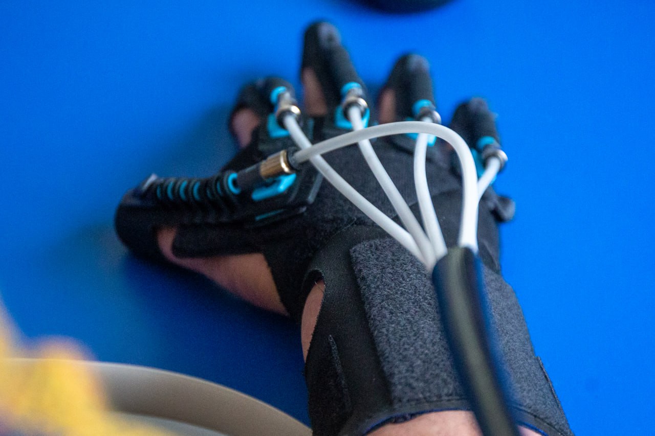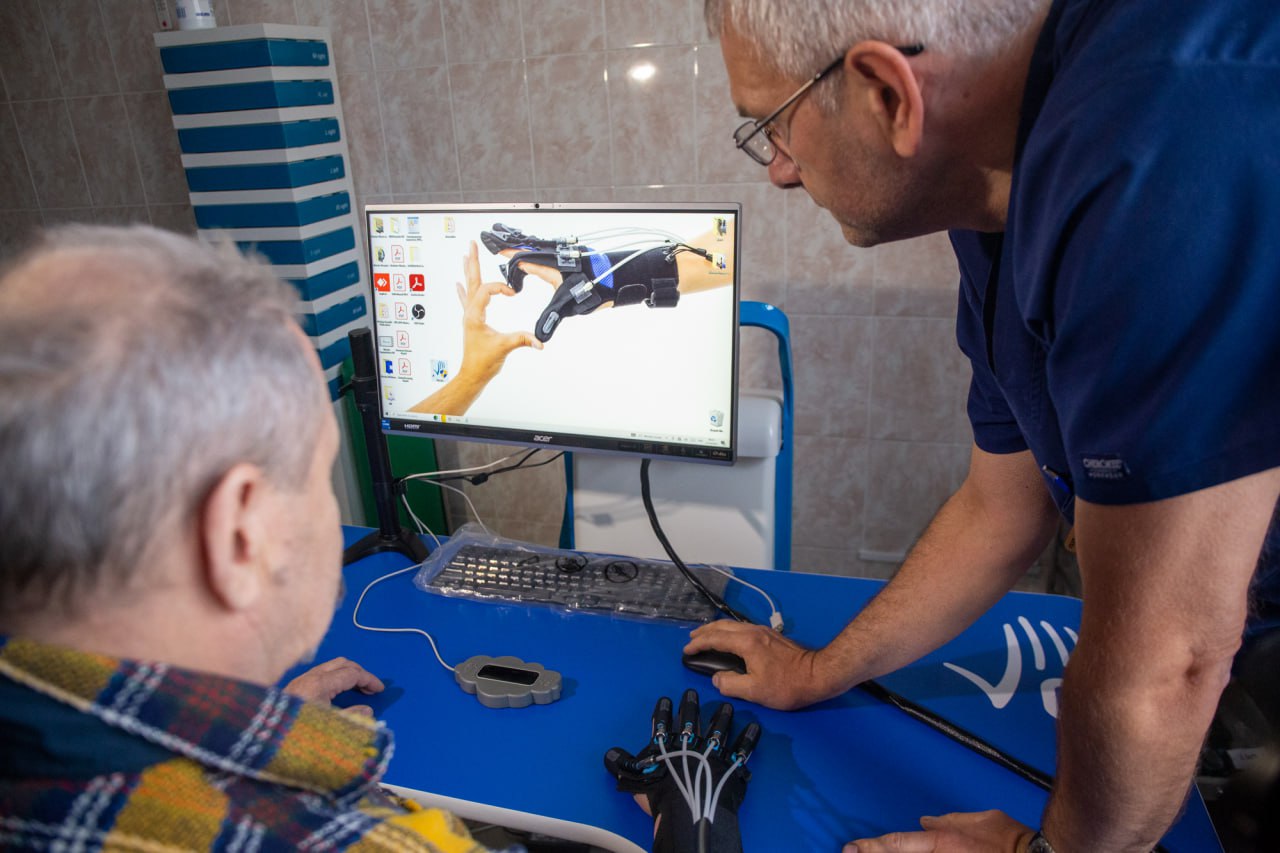 В другом кабинете пожилой пациент разрабатывает кисть руки. После инсульта она потеряла чувствительность, пальцы не слушаются хозяина. Пациент надевает на руку экзоскелет, напоминающий перчатку. После этого робот сам сгибает пальцы больного, и рука «вспоминает» движения. Экзоскелет помогает восстановить чувствительность кисти и утраченные функции.