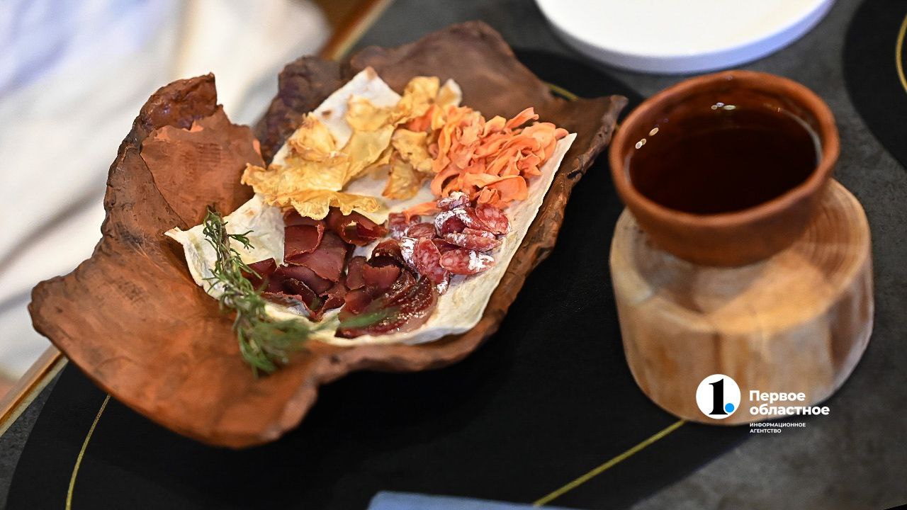 Перед Сергеем ставят блюдо — часть сета «Аркаим»: мясной набор на керамической тарелке-реплике сосуда эпохи бронзы. «Тропа кочевника» символизирует дикую природу вокруг поселения и одновременно рацион древних охотников и воинов.