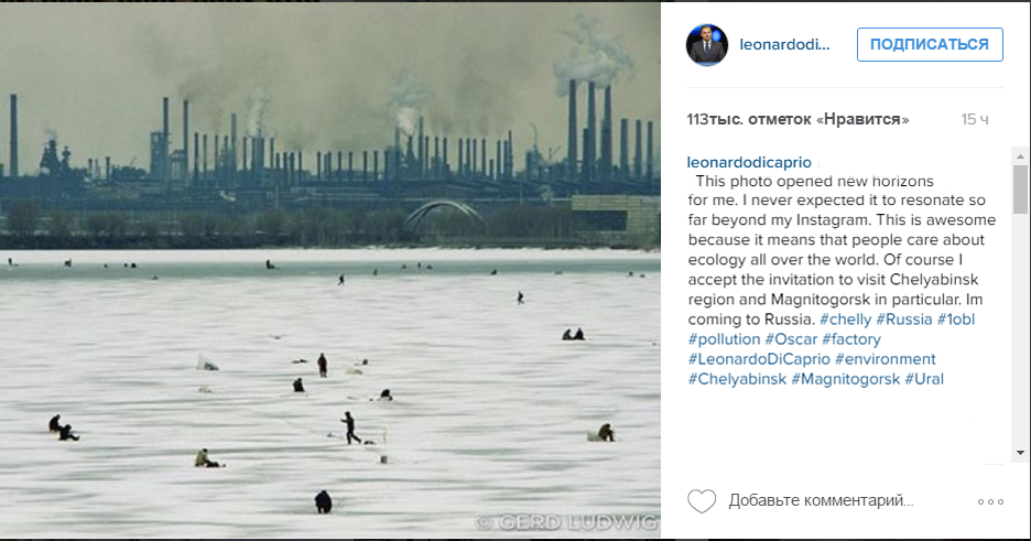 В начале февраля голливудский актер Леонардо ДиКаприо опубликовал в своем Instagram фотографию Магнитогорска. Снимок был сделан в 1994 году фотографом журнала National Geographic Гердом Людвигом и входил в серию под названием «Советское загрязнение: смертельное наследие». На фото изображен Магнитогорский металлургический комбинат и река Урал. Эта публикация вызвала широкий отклик на Южном Урале, став предметом обсуждения на совещании губернатора Челябинской области Бориса Дубровского с главами муниципалитетов. Глава региона отметил, что сейчас экологическая обстановка на Южном Урале намного лучше и пригласил ДиКаприо в гости, чтобы актер мог в этом удостовериться. Спустя 2 месяца уже оскароносный актер ответил на приглашение согласием.