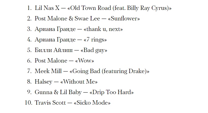 По версии Яндекс список самых популярных треков 2019-го года выглядит таким образом: