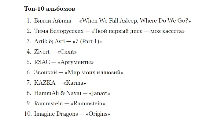 Совершенно ожидаемым для тех, кто слушает музыку ежедневно, стало то, что в на верхушки большинства ТОПов выбились Билли Айлиш, Тима Белорусских, Zivert и Artik & Asti.