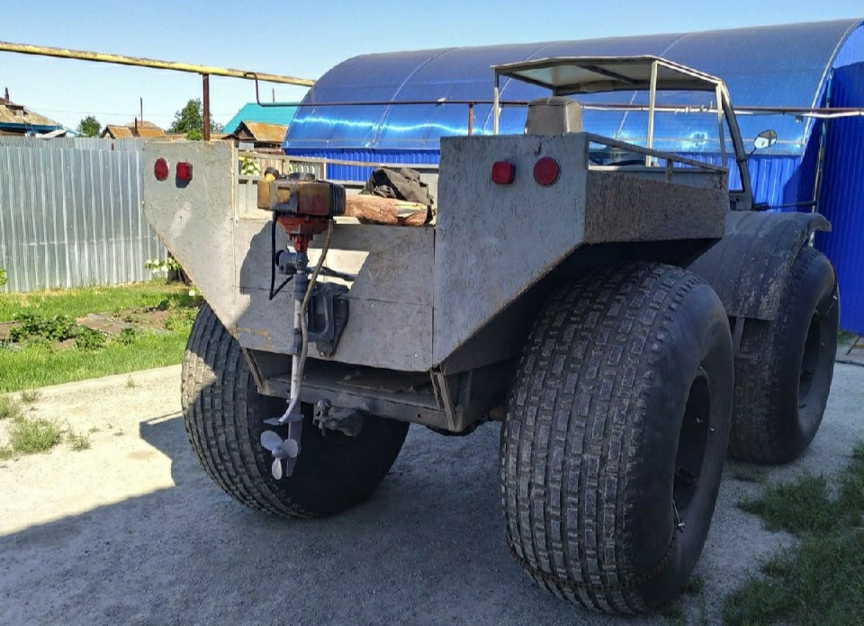 Мосты использовались от «Волги», КПП от «десятки», двухцилиндровый бензиновый двигатель Lifan — новый, остальные детали — с авторазборок. На новом агрегате по земле удалось разогнаться 30 километров в час. Но при этом, если нужно, можно и речку переплыть. На воде машина держится при помощи огромных колес, высотой более метра. На них вездеход при помощи моторчика на корме движется как на воздушной подушке. Эти же шины низкого давления помогают и при езде по болотам и грязи.